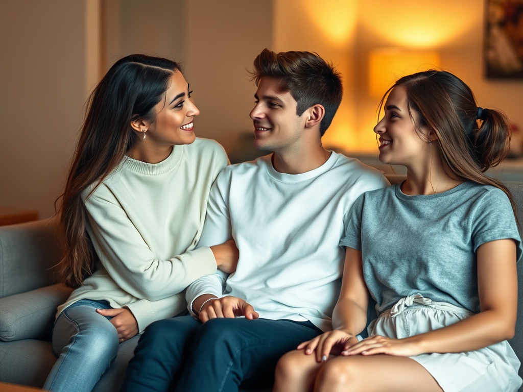Começamos na sala mesmo, no sofá, mais chupações, xanas, seios, manche, e agora também beijos, muitos beijos.