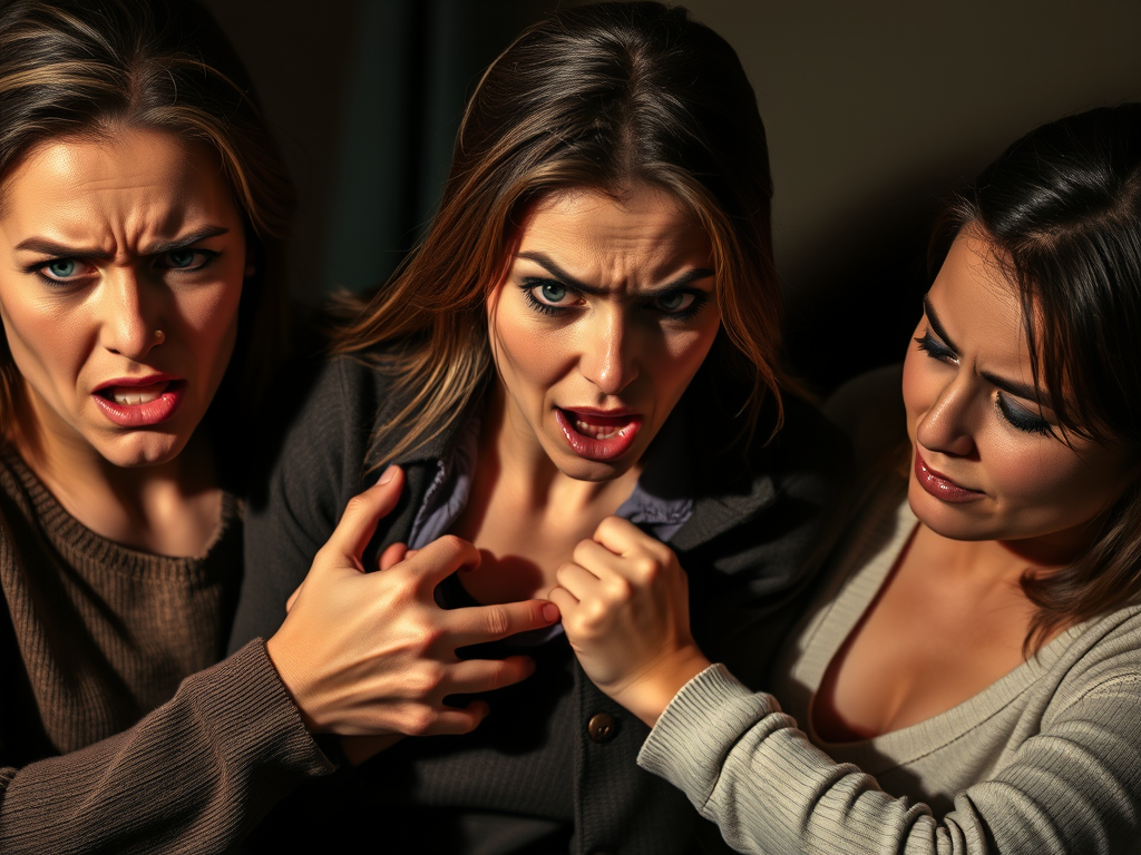 Eu já já estava no chão, depois do chute bem no meio das pernas, quando apareceram duas outras mulheres para contê-la